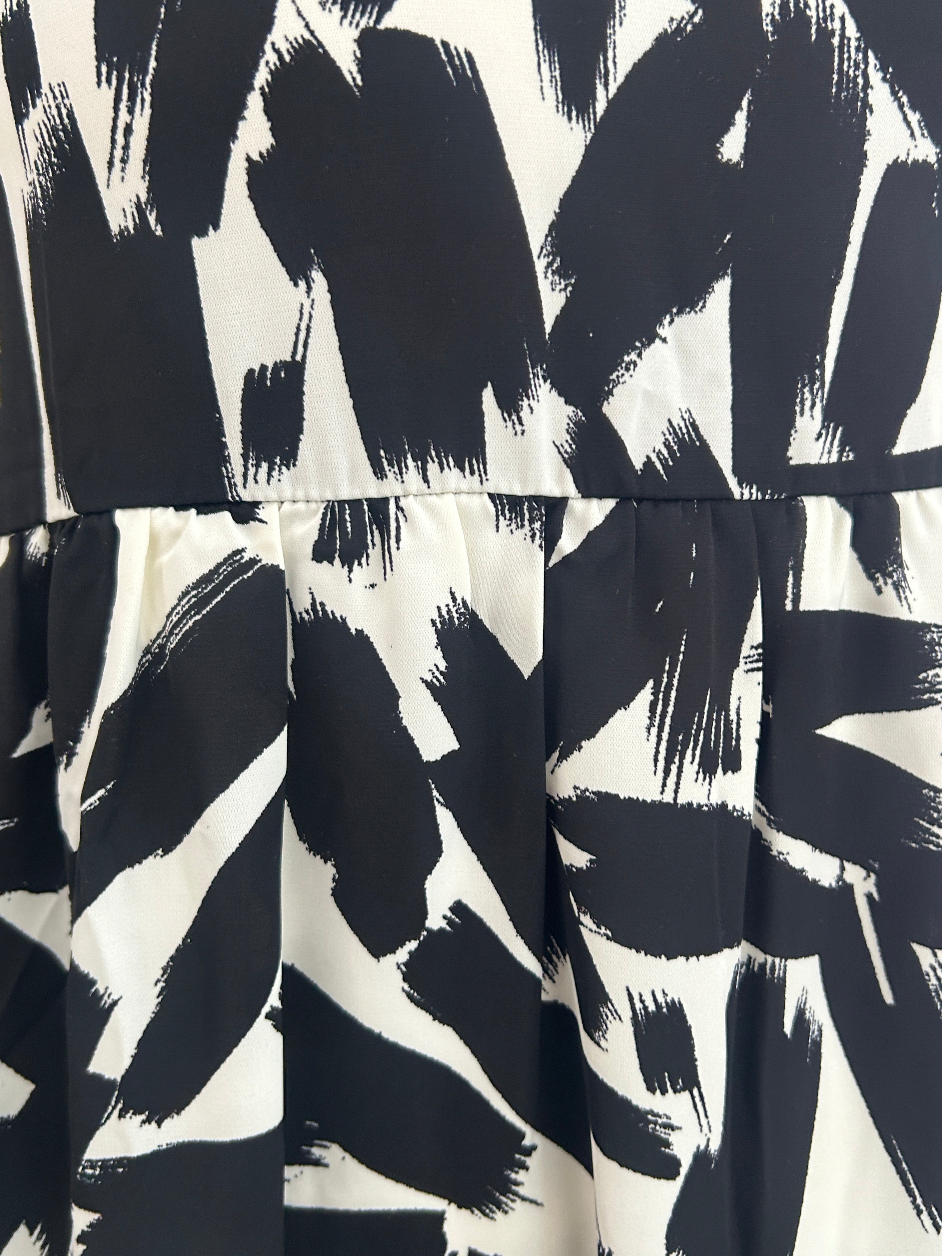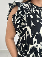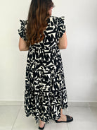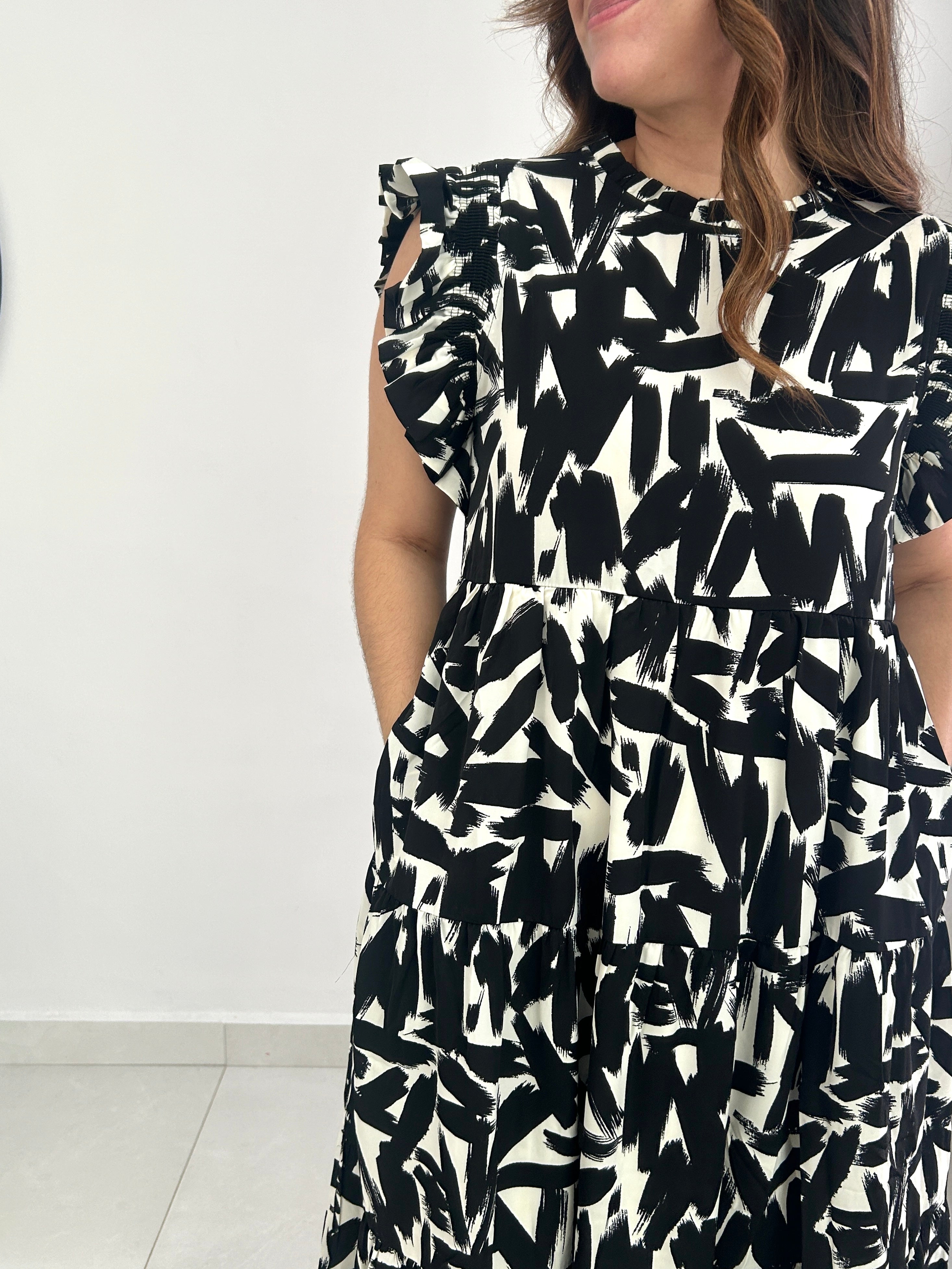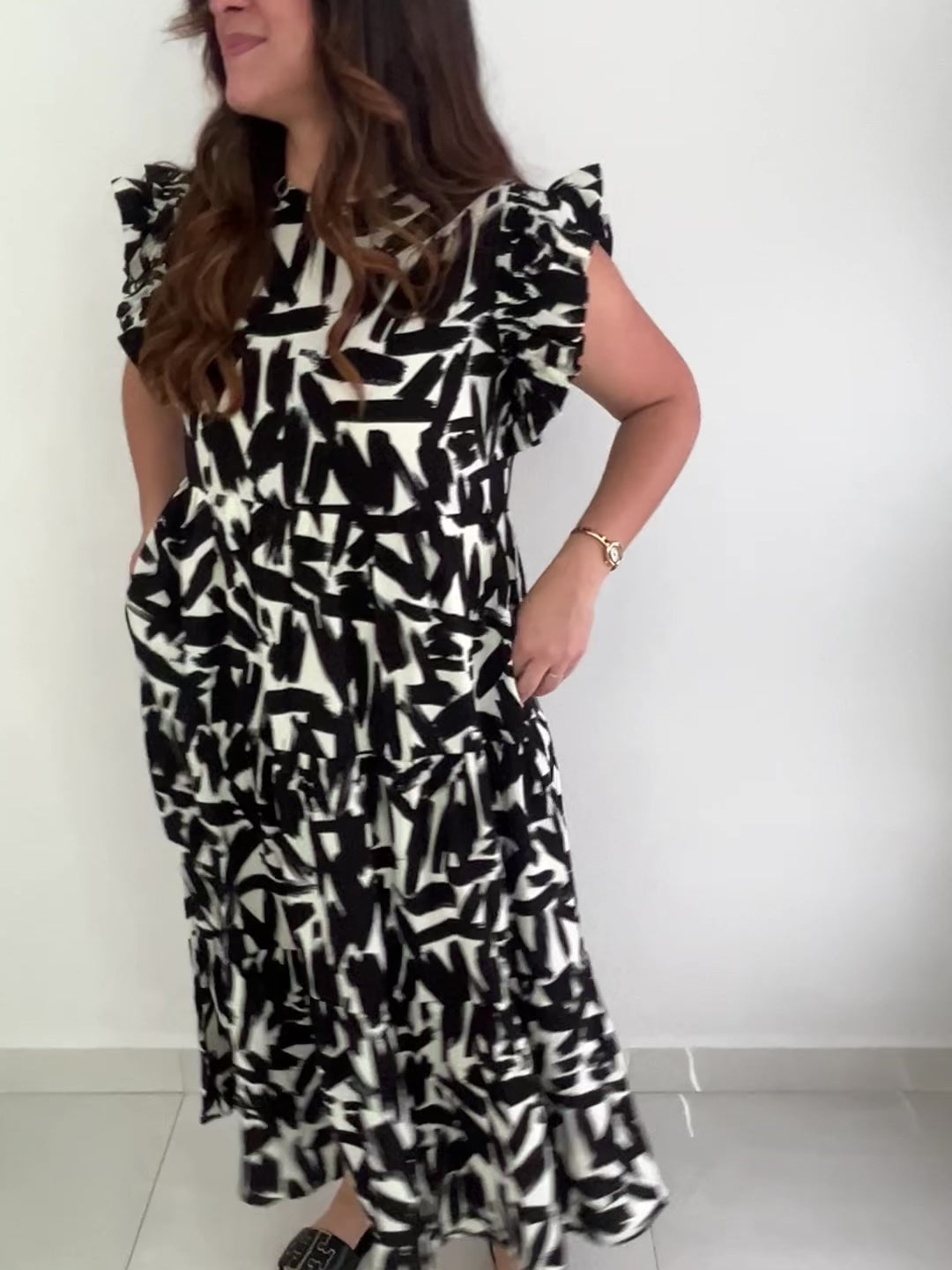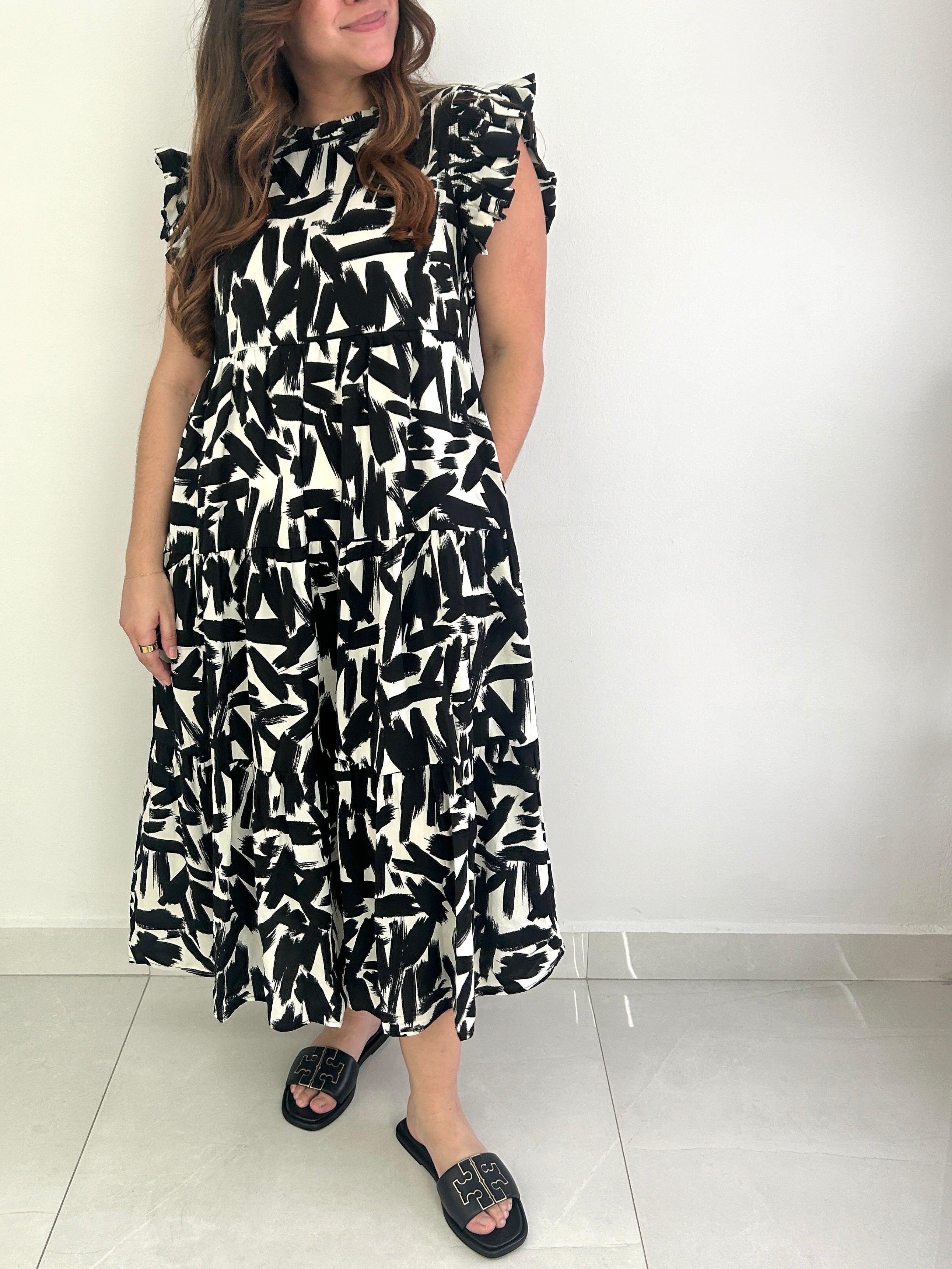 Abstract print maxi dress, back key hole, ruffled shoulder, and tiered layer. The perfect lightweight fabric and non-sheer.