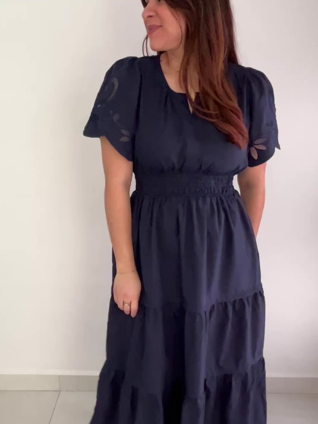 Beautiful solid color maxi dress with U-neckline. Fan favorite with elastic waistline, side pockets, tiered layer, and puffed short sleeves finished with embroidery cut-out edge.