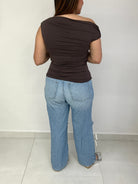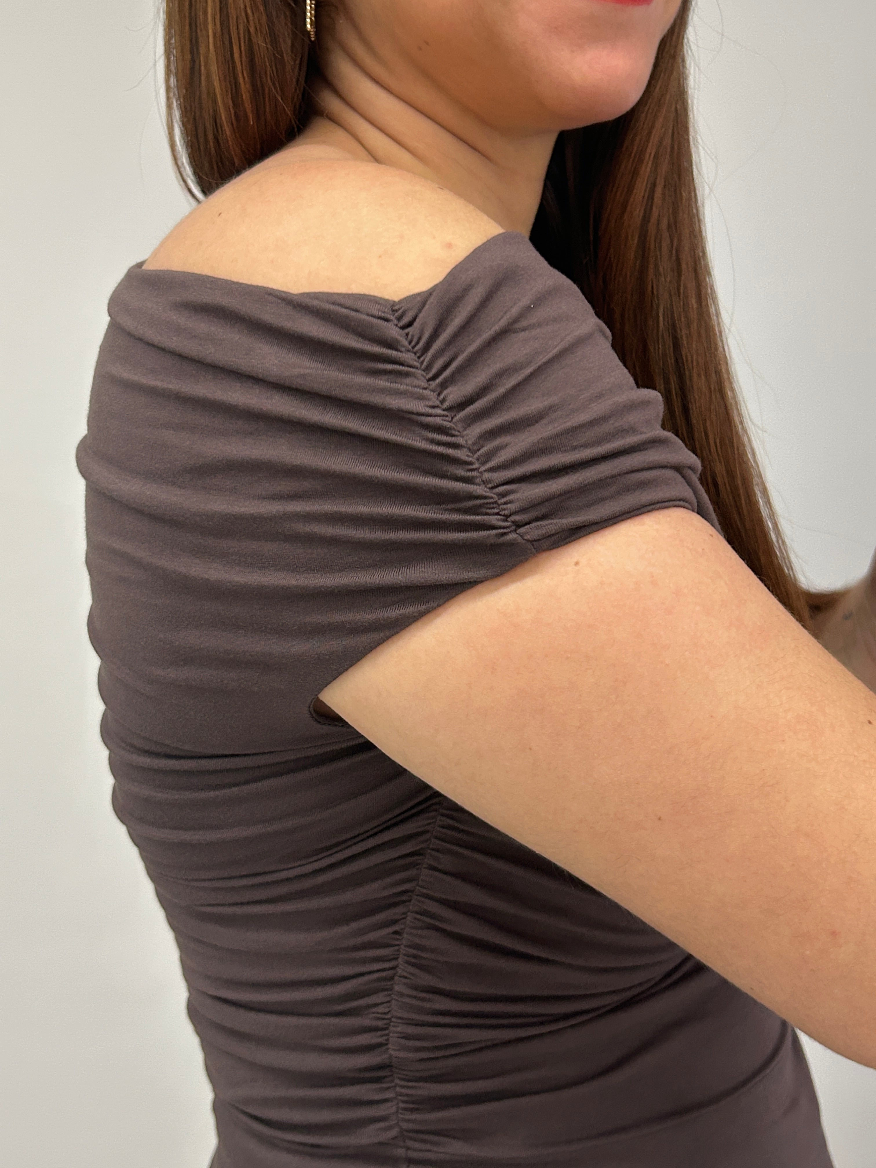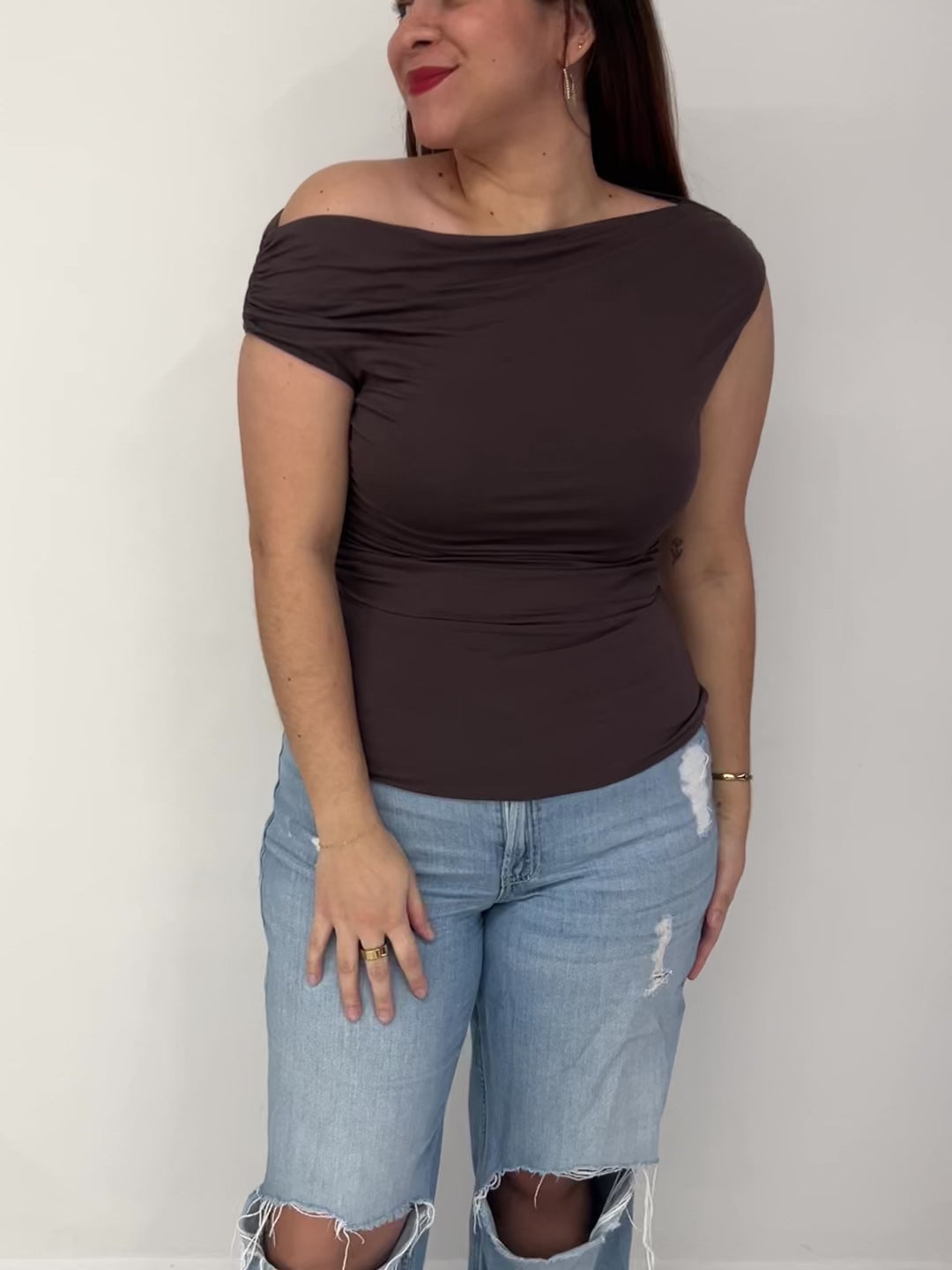 A sleek one shoulder top crafted in a soft stretch fabric for a flattering fit. Ruched detailing throughout creates a chic and feminine silhouette. Perfect for pairing with denim and skirts.