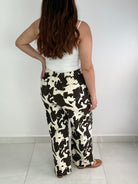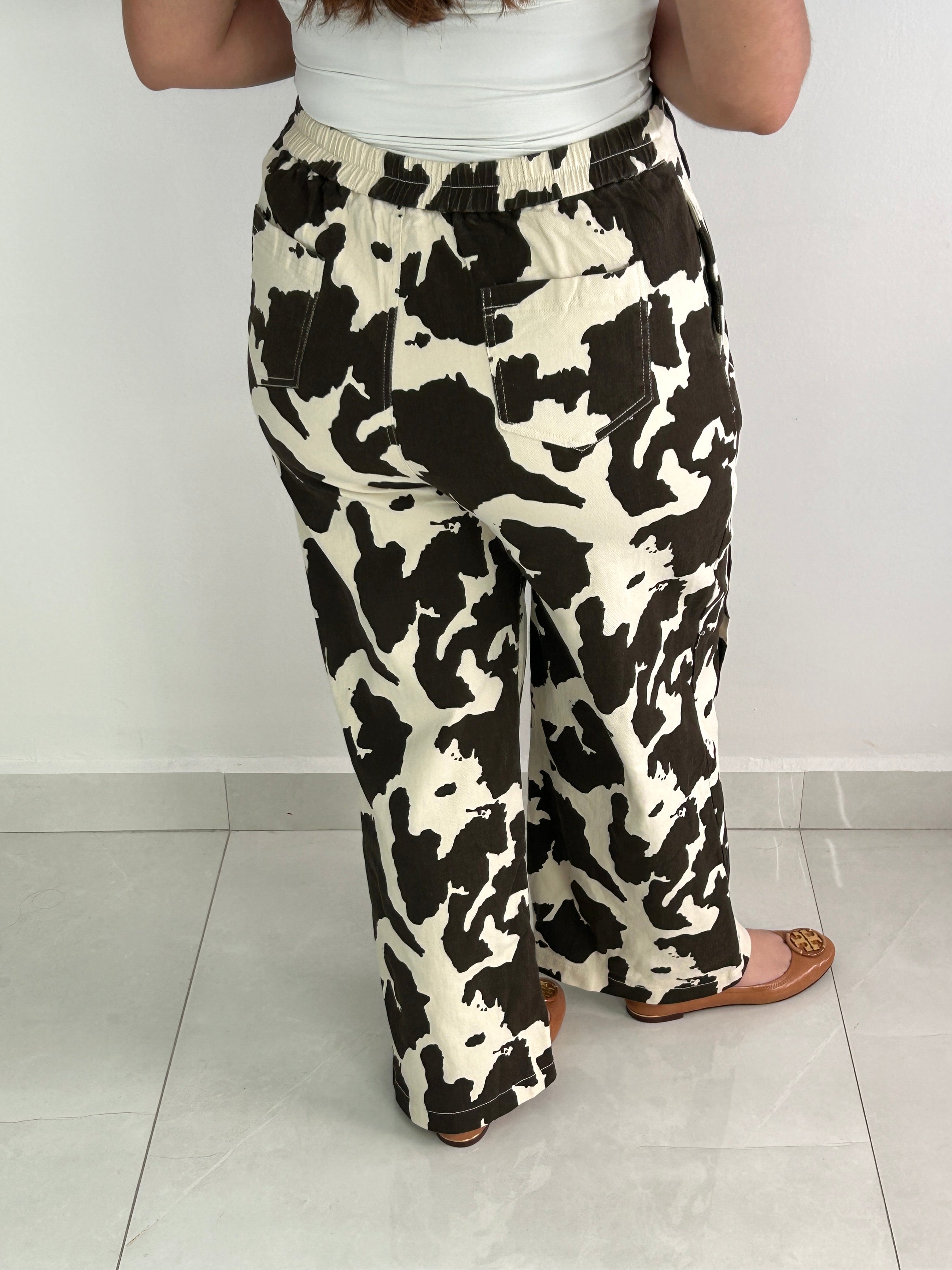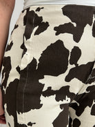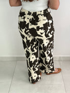 Embrace your inner cowgirl with these cow print wide leg pants! Ultra cool pants that have a high-waisted fit, zipper and clasp closure, and elastic on the back waistband.