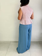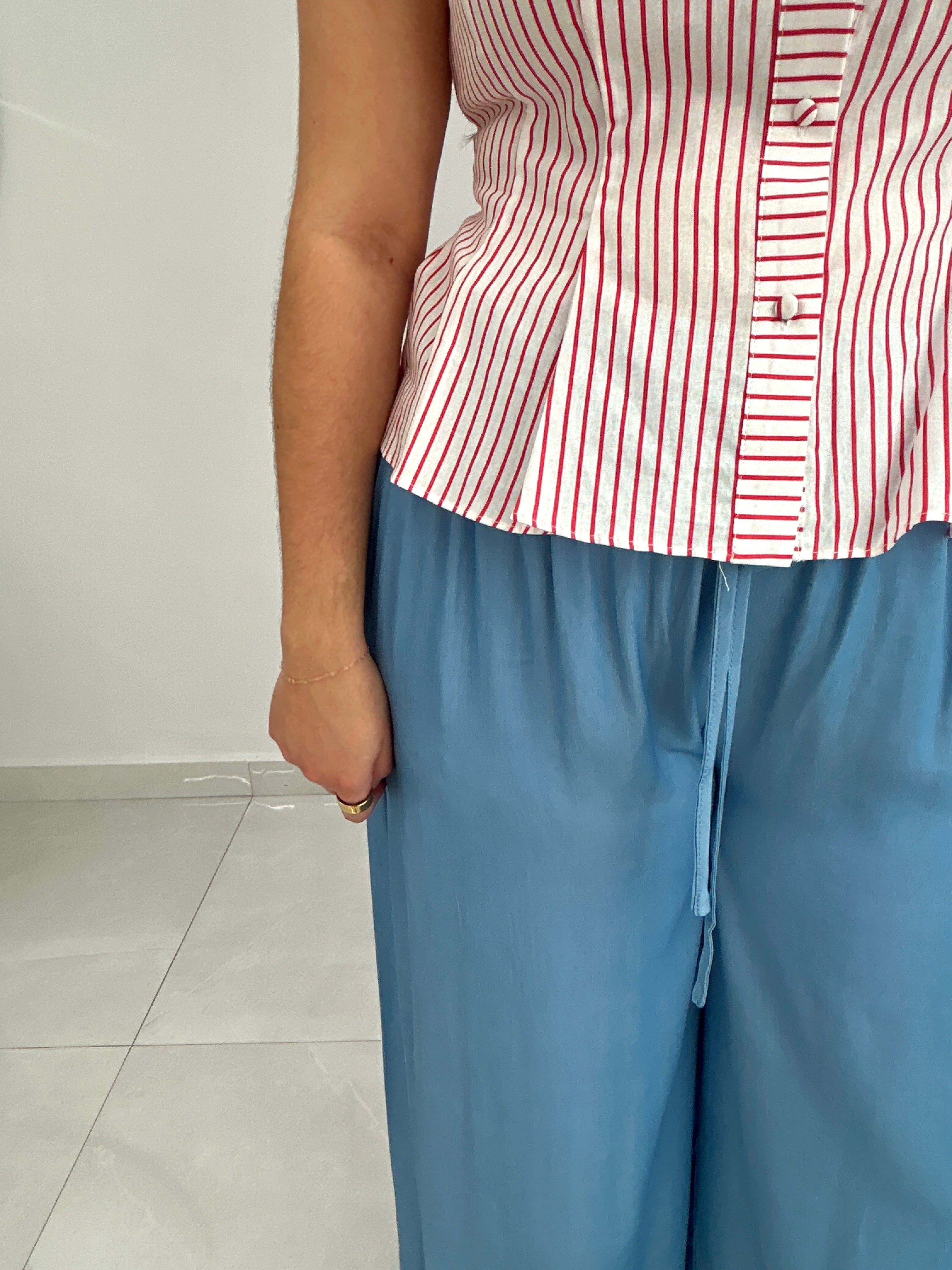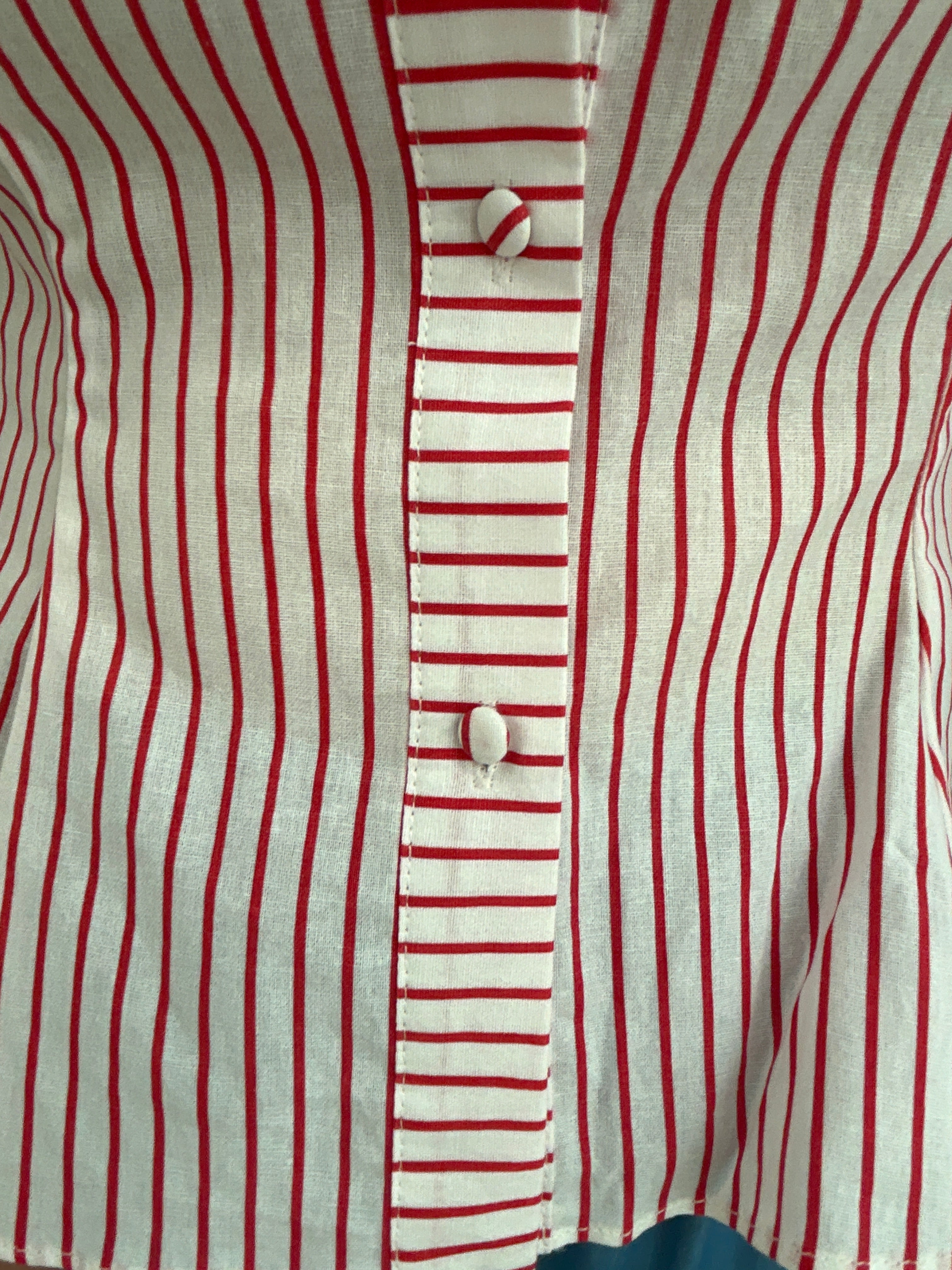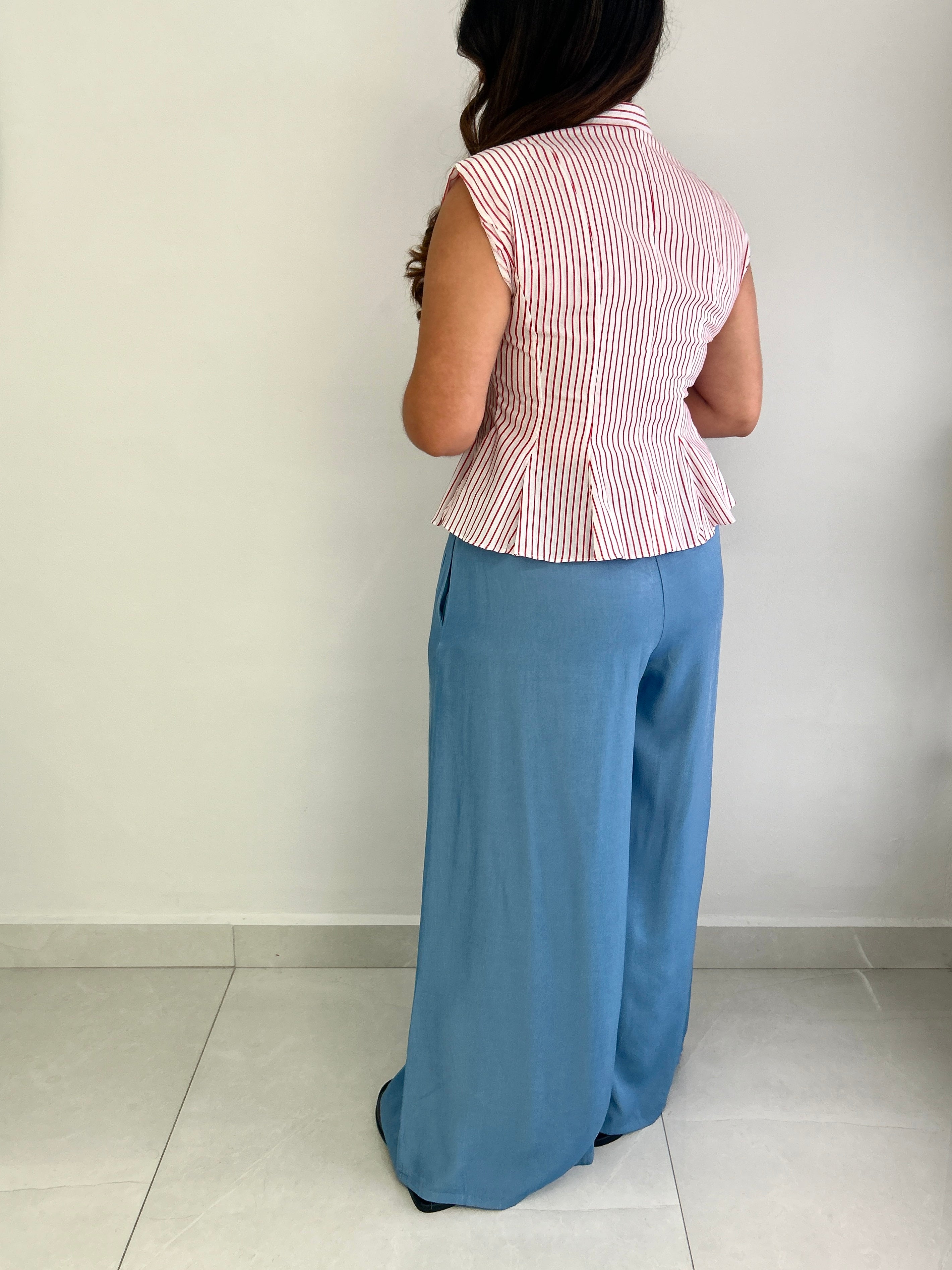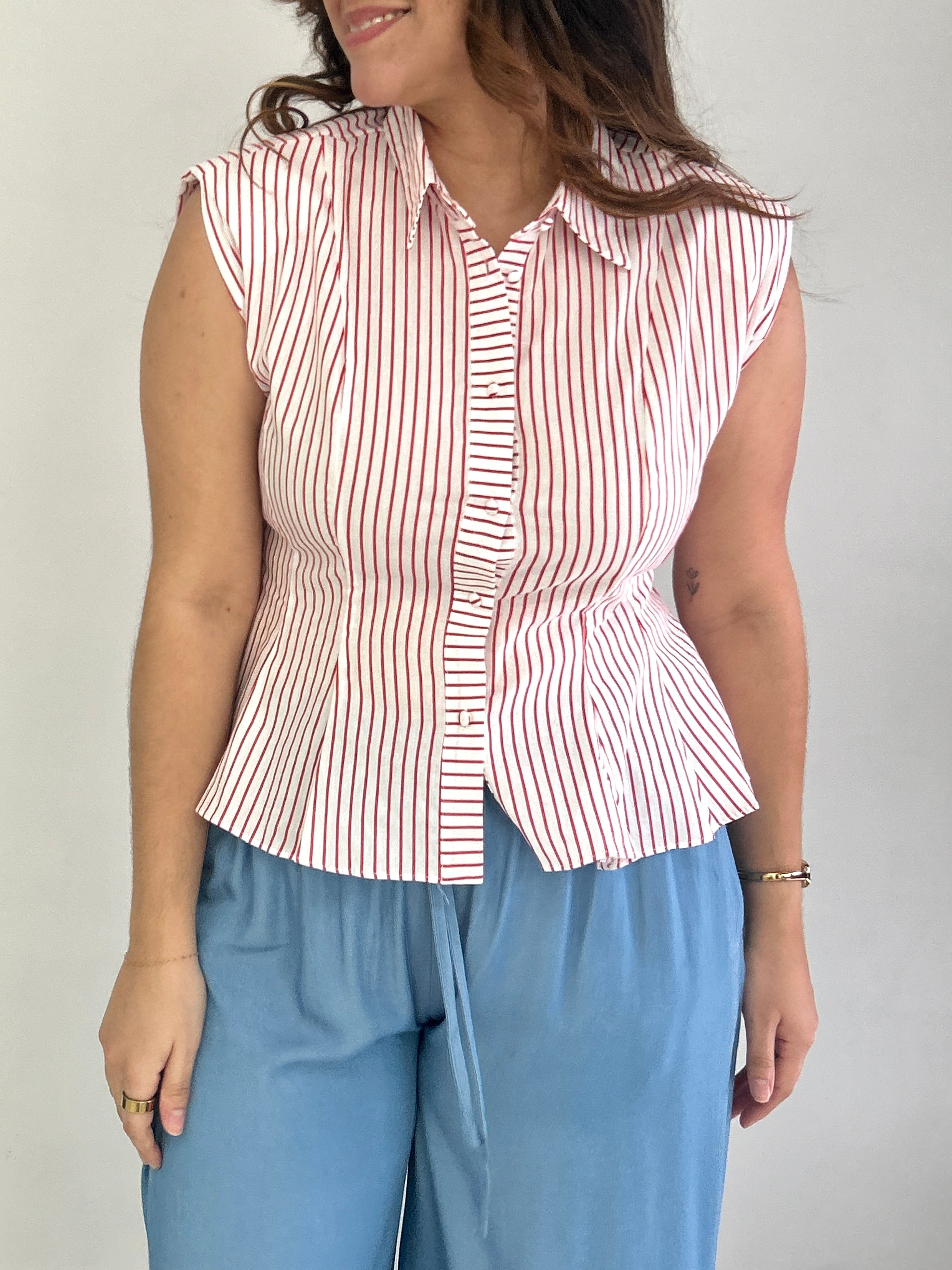 The perfect red stripped sleeveless button down top. The pintuck effect creates a delicate and narrow shape of the waist.